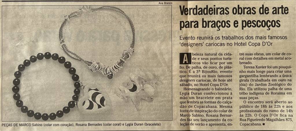 Tereza Xavier foi um pouquinho mais longe para criar uma gargantilha lembrando a única girafa (trabalhada em ouro na joias) do Jardim Zoológico do Rio. Ela utilizou palha de uma tribo indígena de Roraima em suas peças.