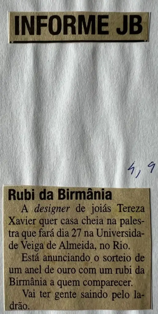 A designer de joias Tereza Xavier sorteia anel de Ouro com um Rubi da Birmânia.