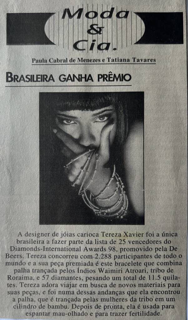 A designer de joias carioca Tereza Xavier foi a única brasileira a fazer parte da lista de 25 vencedores do Diamonds-International Awards 98, promovido pela De Beers. Tereza concorreu com 2.288 participantes de todo o mundo e a sua peça premiada é este bracelete que combina palha trançada pelos índios Waimiri Atroari, tribo de Roraima, e 57 diamantes, pesando um total de 11.5 quilates.