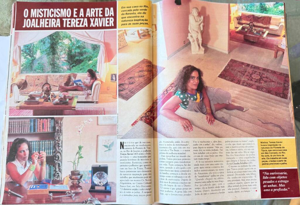 Mística, Tereza Xavier busca inspiração na natureza da Floresta da Tijuca, que cerca sua casa em São Conrado, no Rio. No sofá, lê um livro de arte. Ela trabalha em suas peças, criadas a partir de pedras preciosas e palha.