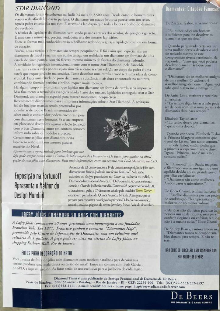 O D-IA existe há 43 anos e é considerado o Oscar da joalheria mundial. Dentre as 25 peças vencedoras de 98, o bracelete em palha e 57 Diamantes criado pela brasileira Tereza Xavier estarão em plena loja da Quinta Avenida, N.York. A designer; que se prepara para concorrer na edição do primeiro D-IA do novo milênio, também está nas páginas da revista Jewellery News Asia, de dezembro.